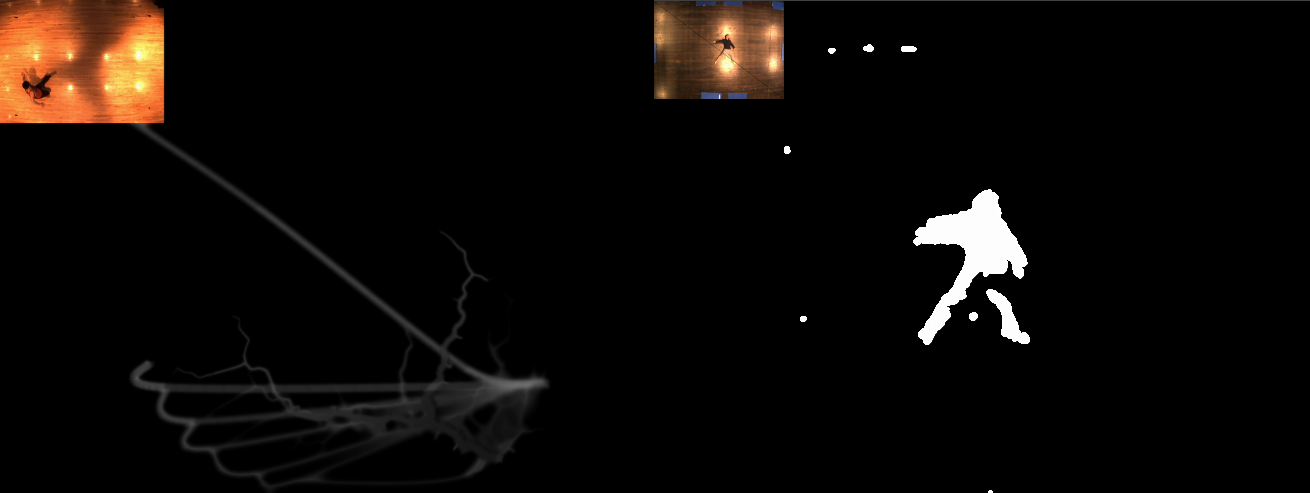 Bird's Eye Bird's Eye is a collaboration between Computer Science and Dance, an interactive dance piece that explores perspective, sensing, time and memory. An investigation into computational perception for performance, the dance piece uses a projector-camera system to track the dancer and provide live visualizations of the past, present and future states of the dance. A projector-camera system was developed leveraging some of the technology built for the IMP. The system uses an overhead prosilica ethernet camera and software written in Processsing for both the image processing and the visualizations. The dance was choreographed by Peggy Florin and performed by Ben Wolk. |